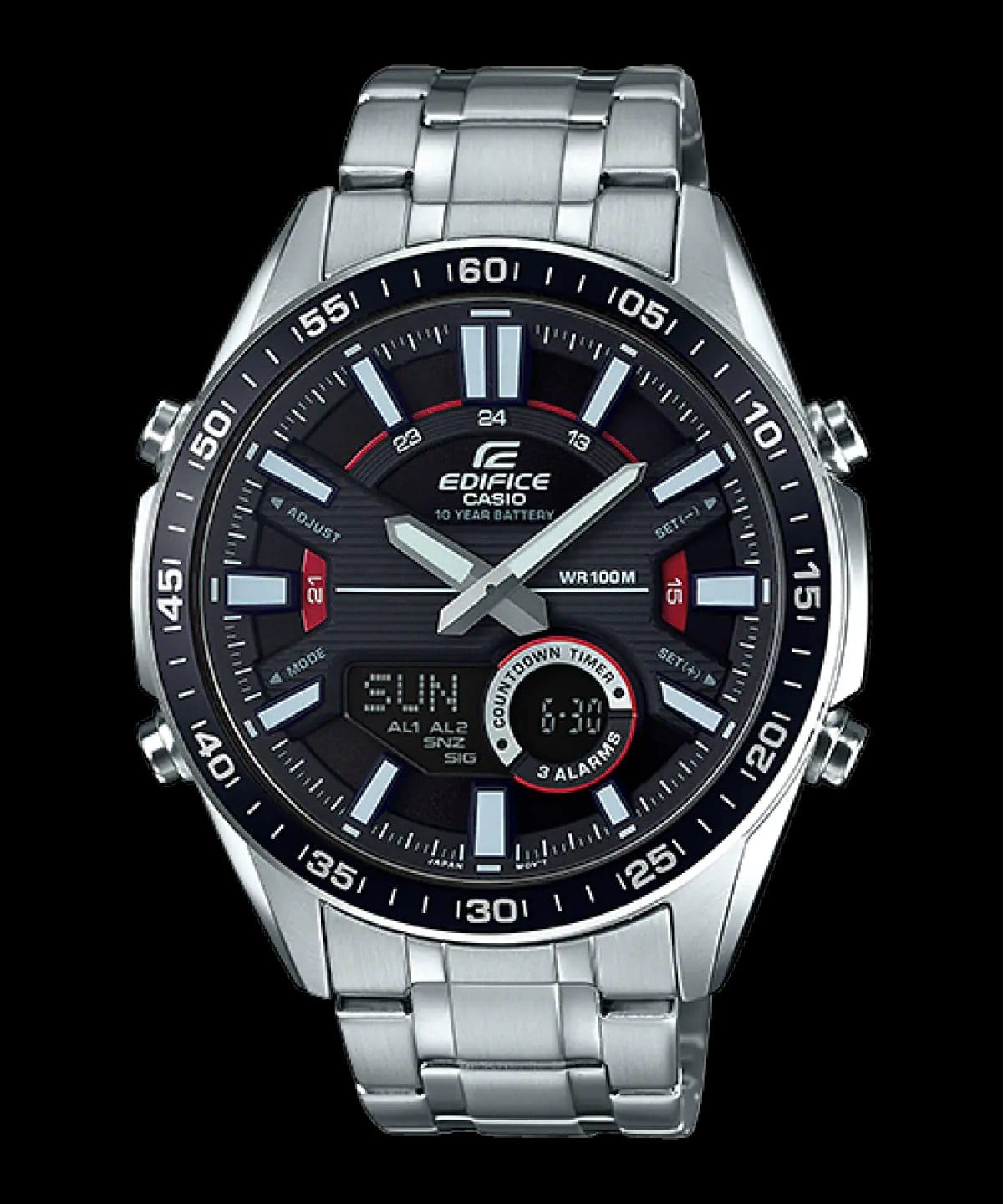 This watch is an analog/digital combination model. The model displays a full range of functions, including world time, stopwatch, and timer functions on its LCD. The two-layered, three dimensional dial creates a dynamic, sporty design. An ideal model for everyday use. Sleek Precision Meets Modern Functionality: Casio Edifice EFV-C100D-1AVDF